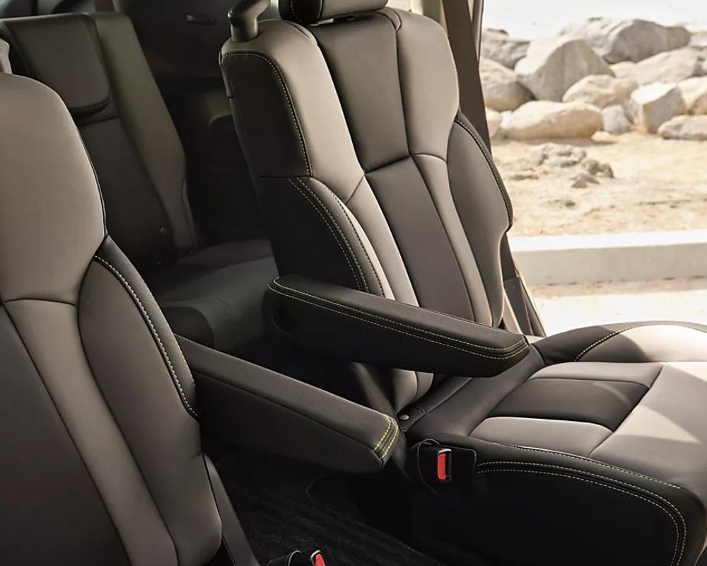 The cabin has enough room for 7 or 8 passengers, depending on your trim. Surfaces are covered with cloth, leather, or premium Nappa leather for high-end models. Standard features include automatic three-zone climate control, cup holders, and a 12-volt centre console to keep your devices charged. The cargo area can hold 458 litres with all seats up and 2,140 litres when the second and third rows are down.