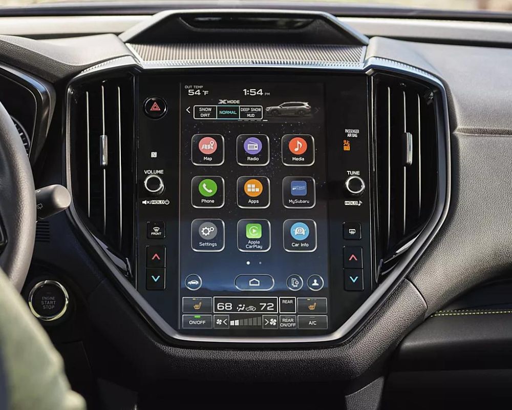 The standard infotainment system in the 2024 Ascent is an 11.6-inch tablet-style touchscreen display with six speakers. It supports Bluetooth connectivity, USB-A and USB-C ports, Apple CarPlay/Android Auto, Subaru Starlink connected services, and SiriusXM. Higher trims have a similar display but include navigation and the optional 14-speaker Harman Kardon sound system.